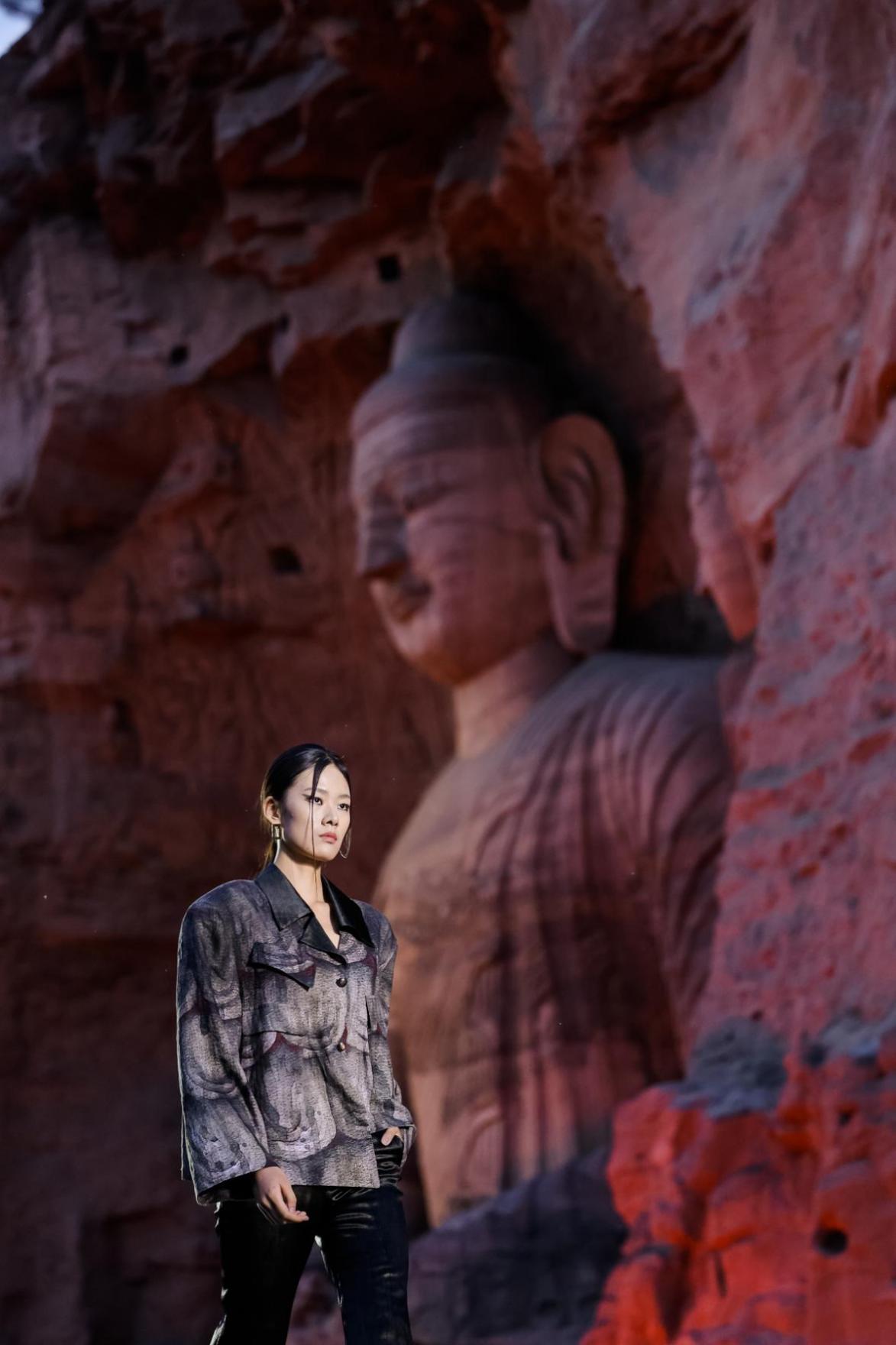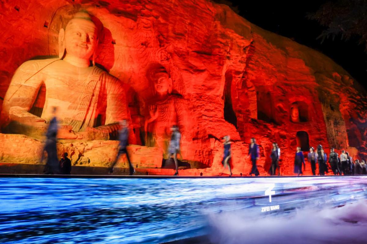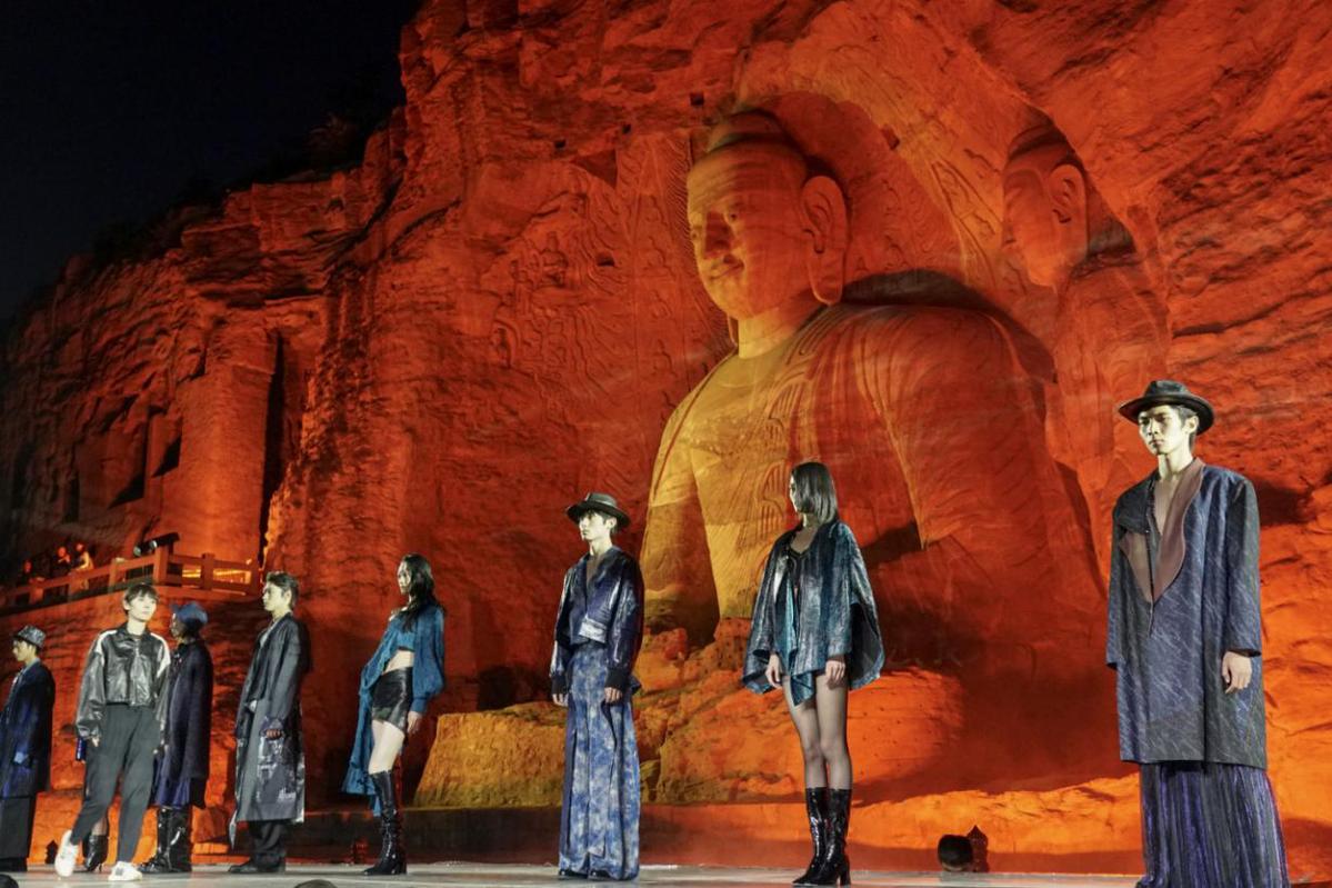 9月29日,在山西省大同市云冈石窟,模特在展示设计师王紫菲设计的时装。(主办方供图)
