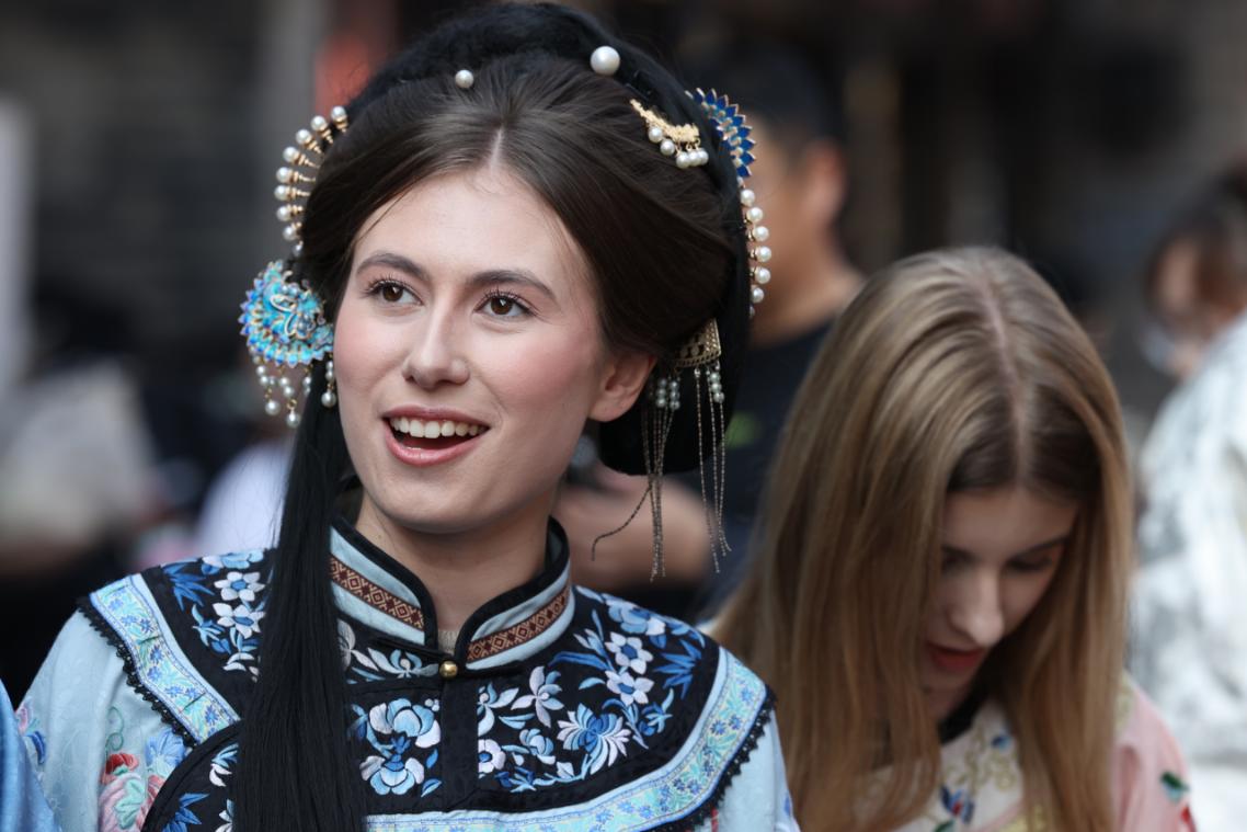 24岁的乌克兰博主卡丽娜(Karyna Kovalevska),首次换上晋商服饰走进平遥古城。在青砖灰瓦的映衬下,她沉浸式感受着百年晋商文化的厚重底蕴。