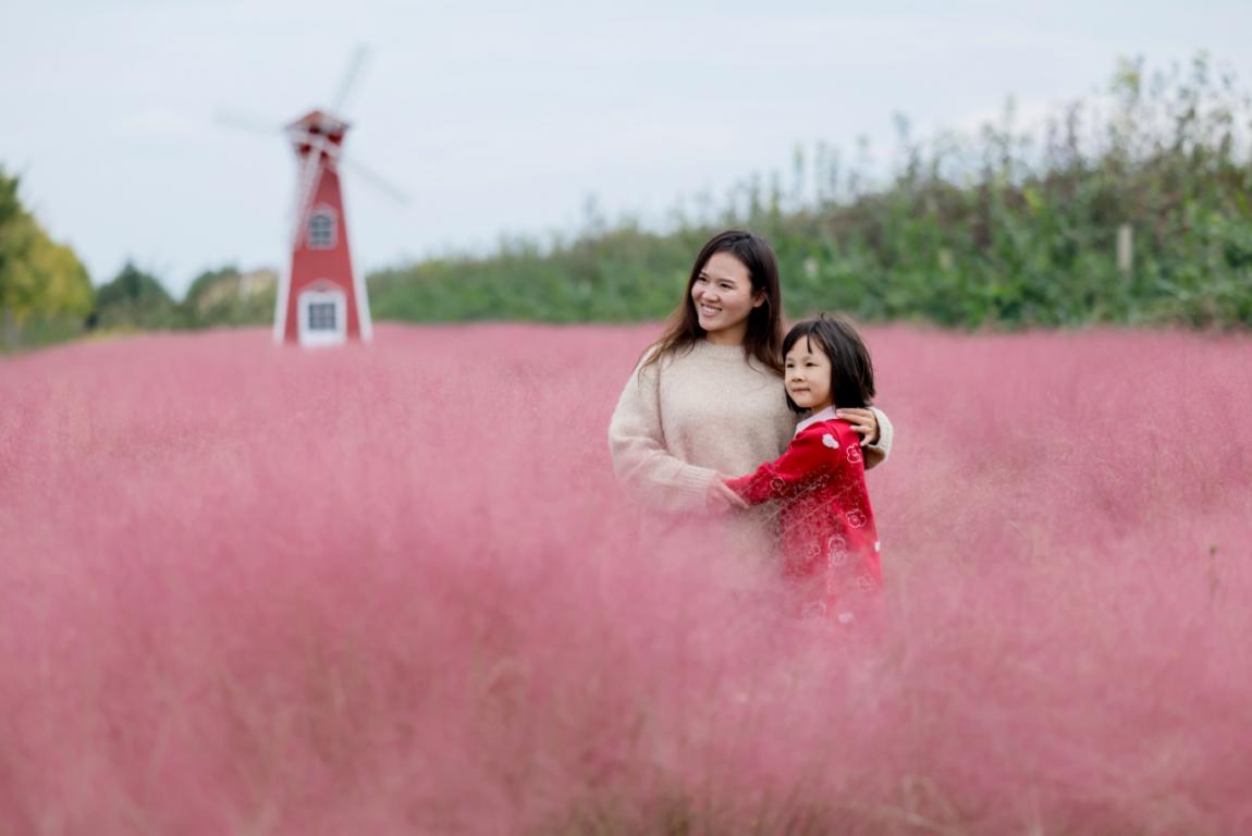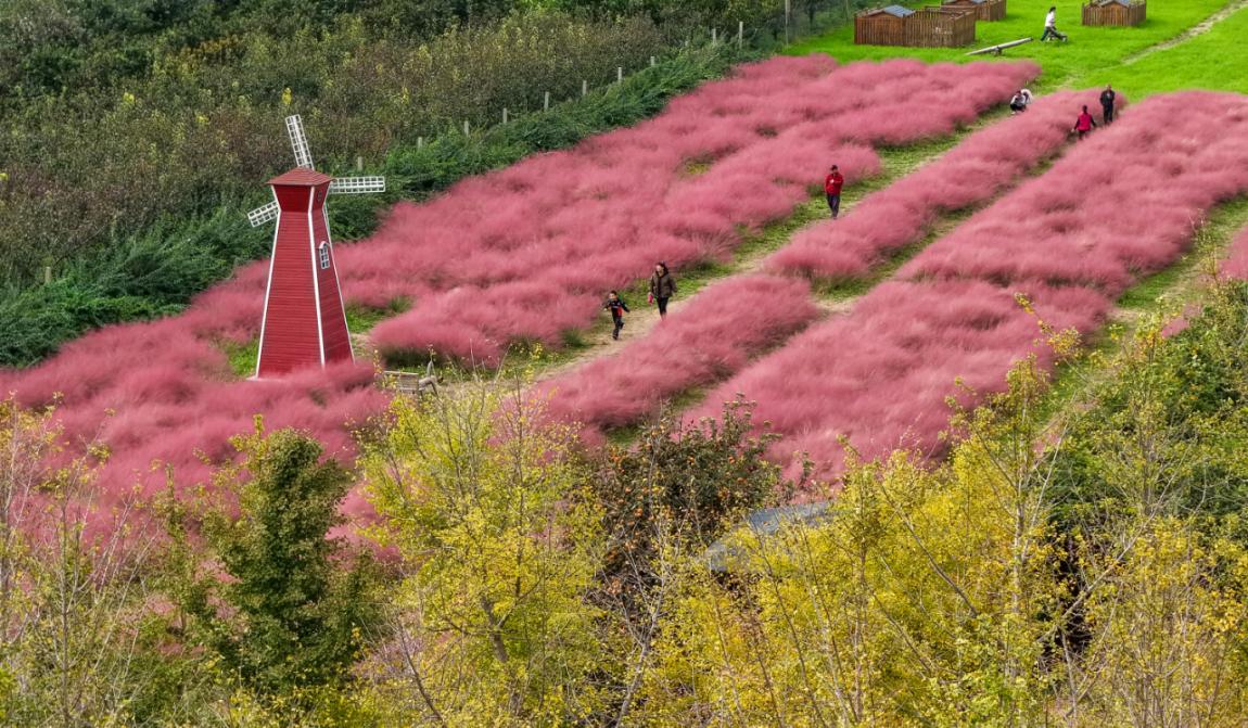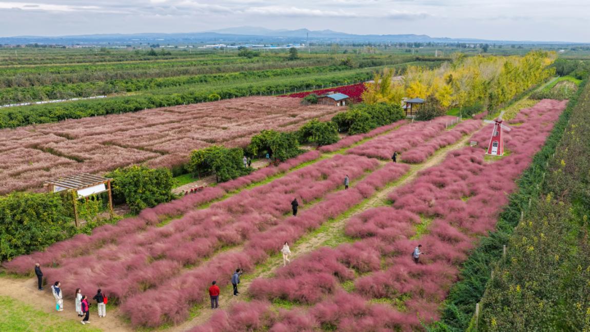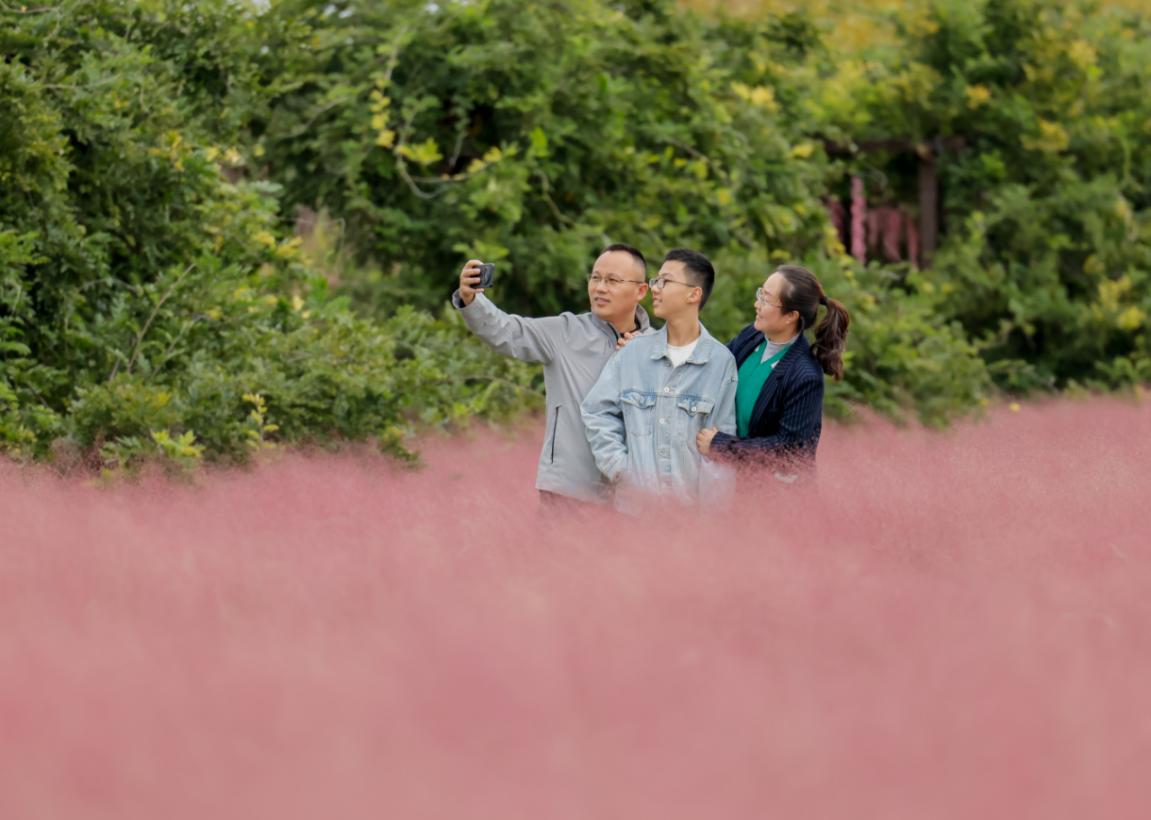 在山西省运城市临猗县三管镇,游客在粉黛乱子草中打卡拍照。(闫鑫 摄)